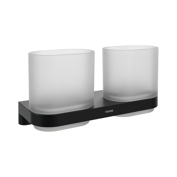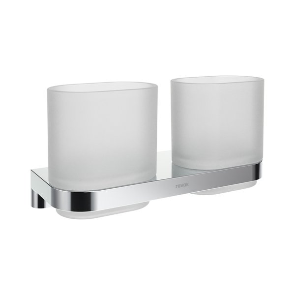 Тримач з двома склянками д/зубних щіток на двох штифтах та регулювальній металевій затискній пластині.. Відстань між гвинтами становить 66 мм. Монтажний комплект входить до комплекту. Тримач оснащений пластиковим кільцем з внутрішньої сторони для м'якої фіксації скляної ємності. Для повного рішення та гармонійного дизайну ванної кімнати рекомендуємо поєднувати його з іншими аксесуарами Chrome II. Для зовнішнього очищення рекомендуємо використовувати засіб RAVAK Cleaner Chrome.