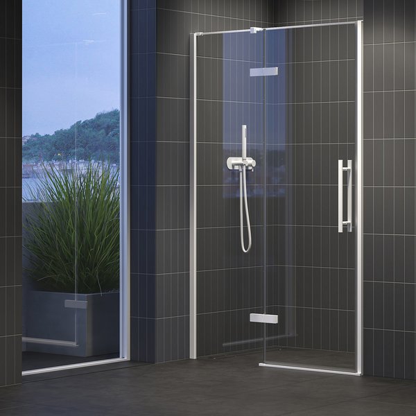 Двоелементні душові двері COOL! у виконанні глянцевий хром чи чорний. Вітраж із прозорого скла із захисним шаром RAVAK Anticalc®. Шарнірна система відкриття. Поворотний продукт для лівої та правої версій. Ідеальне рішення для створення душового простору у ніші шириною 100 – 120 cm.