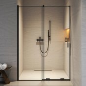 Двоелементні душові двері Roll у виконанні глянцевий хром чи чорний. Вітраж із прозорого скла із захисним шаром RAVAK Anticalc®. Шарнірна система відкриття. Поворотний продукт для лівої та правої версій. Ідеальне рішення для створення душового простору у ніші шириною 100 – 140 cm.